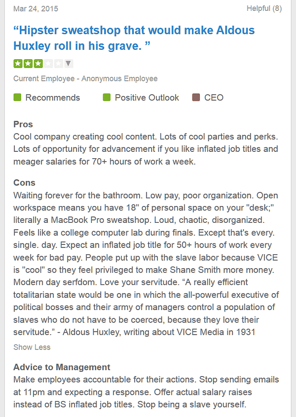 An anonymous review of Vice Media via: glassdoor. Aldous Huxley, for reference, is an author that wrote about a dystopian dictatorship that perverted human values. Discouraging all forms of long-term thinking in support of short-term pay-offs.